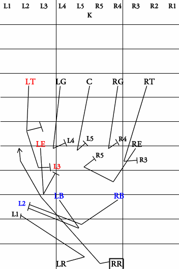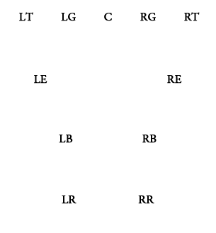 To talk about the kickoff players, we need to number them. Kickers do not always kick from the middle of the field, so we will count the kickoff team from the outside in on each side, ignoring the kicker location. Once we pick a gap, two double-team blocks will be used to pry that gap open wider. In this case we will double-team L2 and L3 away from each other.